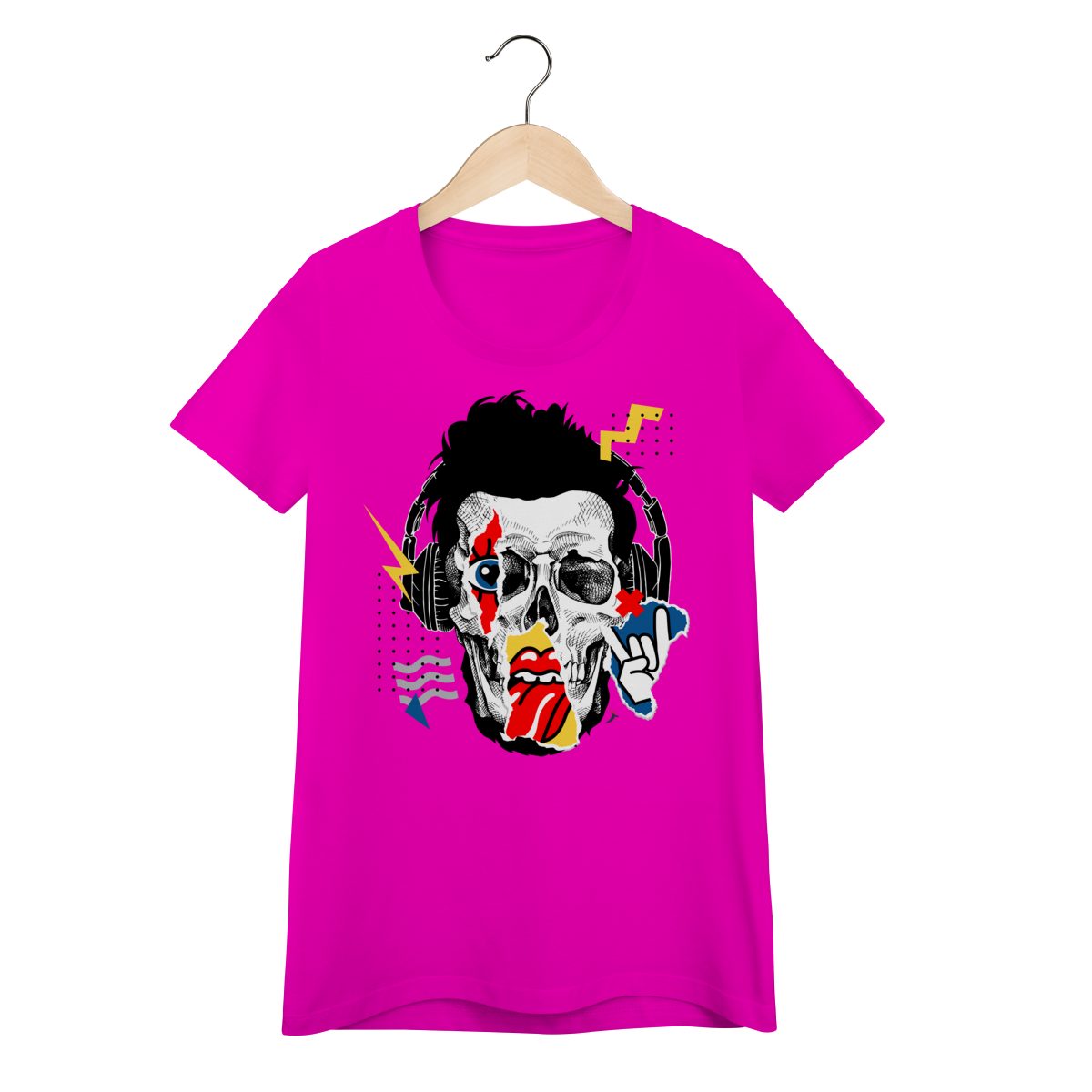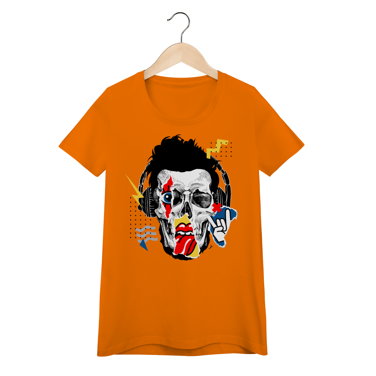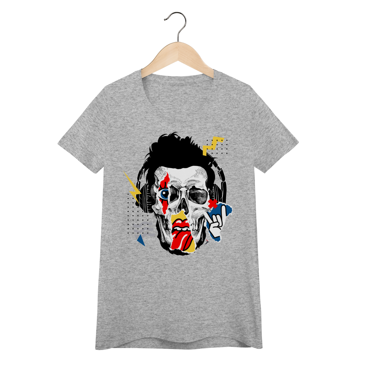 Estampa impactante em estilo pop art/street, trazendo um rosto de caveira com fones de ouvido e elementos gráficos (raios, recortes e pontilhados). Um visual cheio de atitude, perfeito para quem curte música, rock e uma pegada urbana moderna.