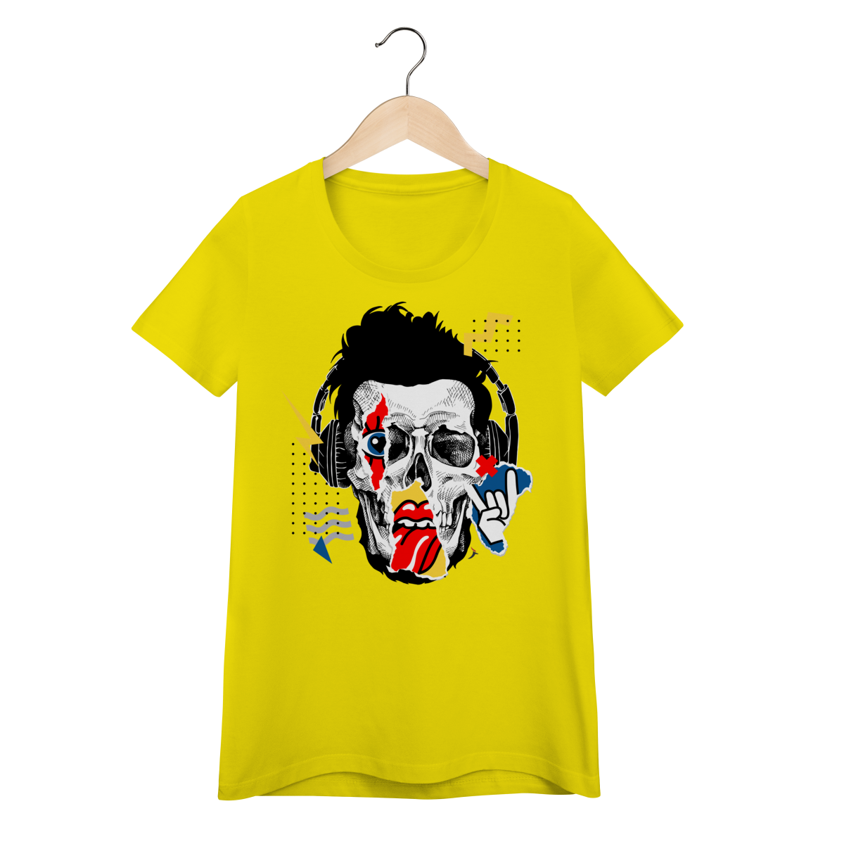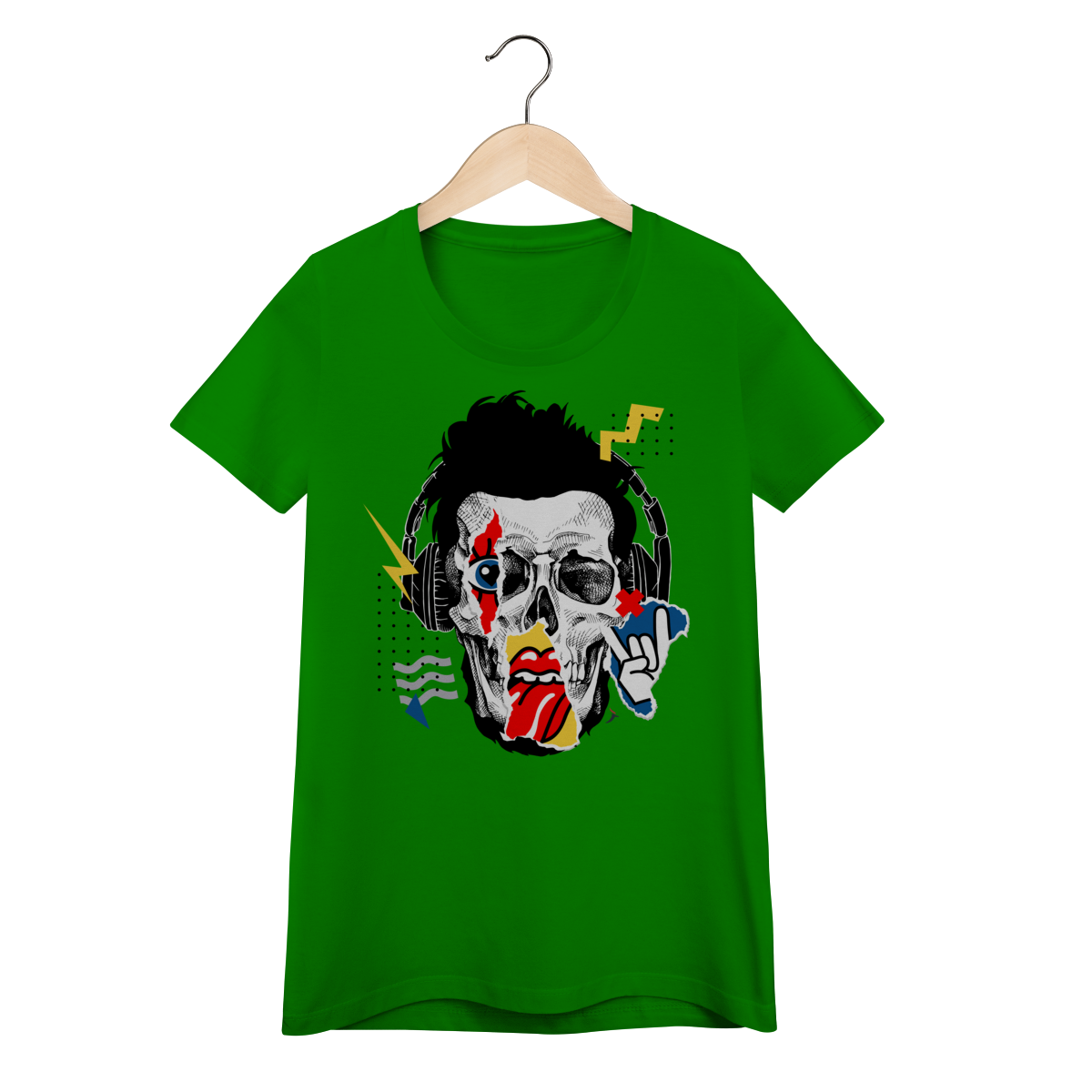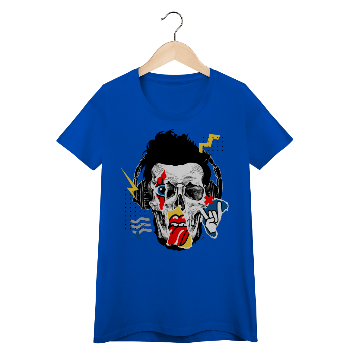 Estampa impactante em estilo pop art/street, trazendo um rosto de caveira com fones de ouvido e elementos gráficos (raios, recortes e pontilhados). Um visual cheio de atitude, perfeito para quem curte música, rock e uma pegada urbana moderna.