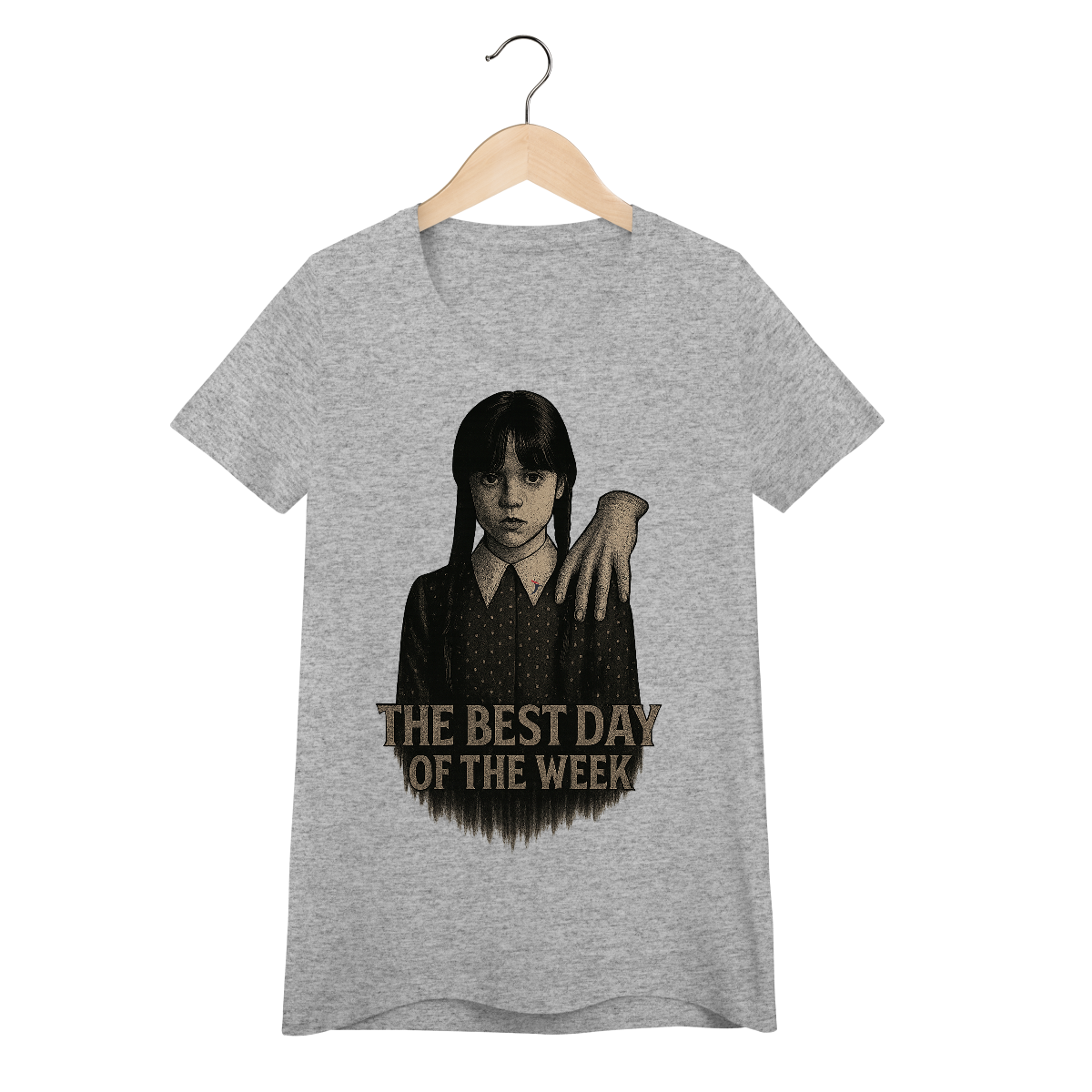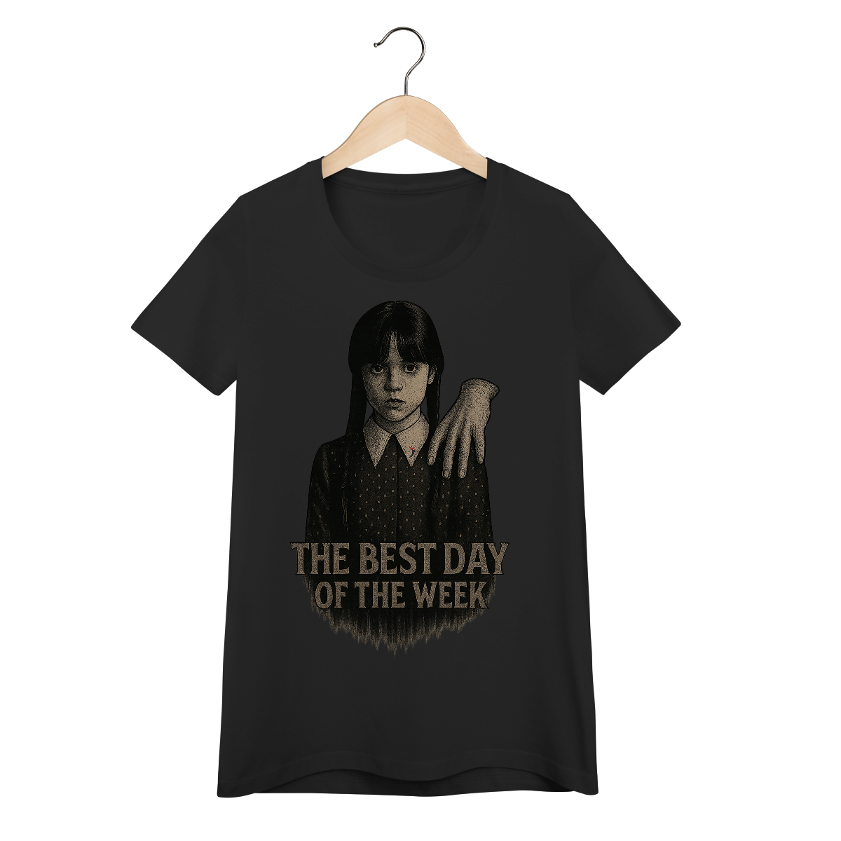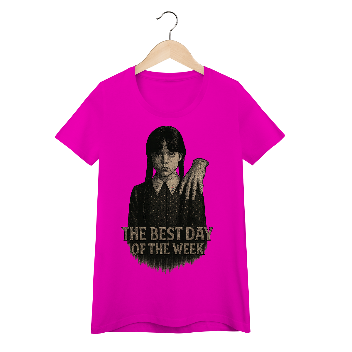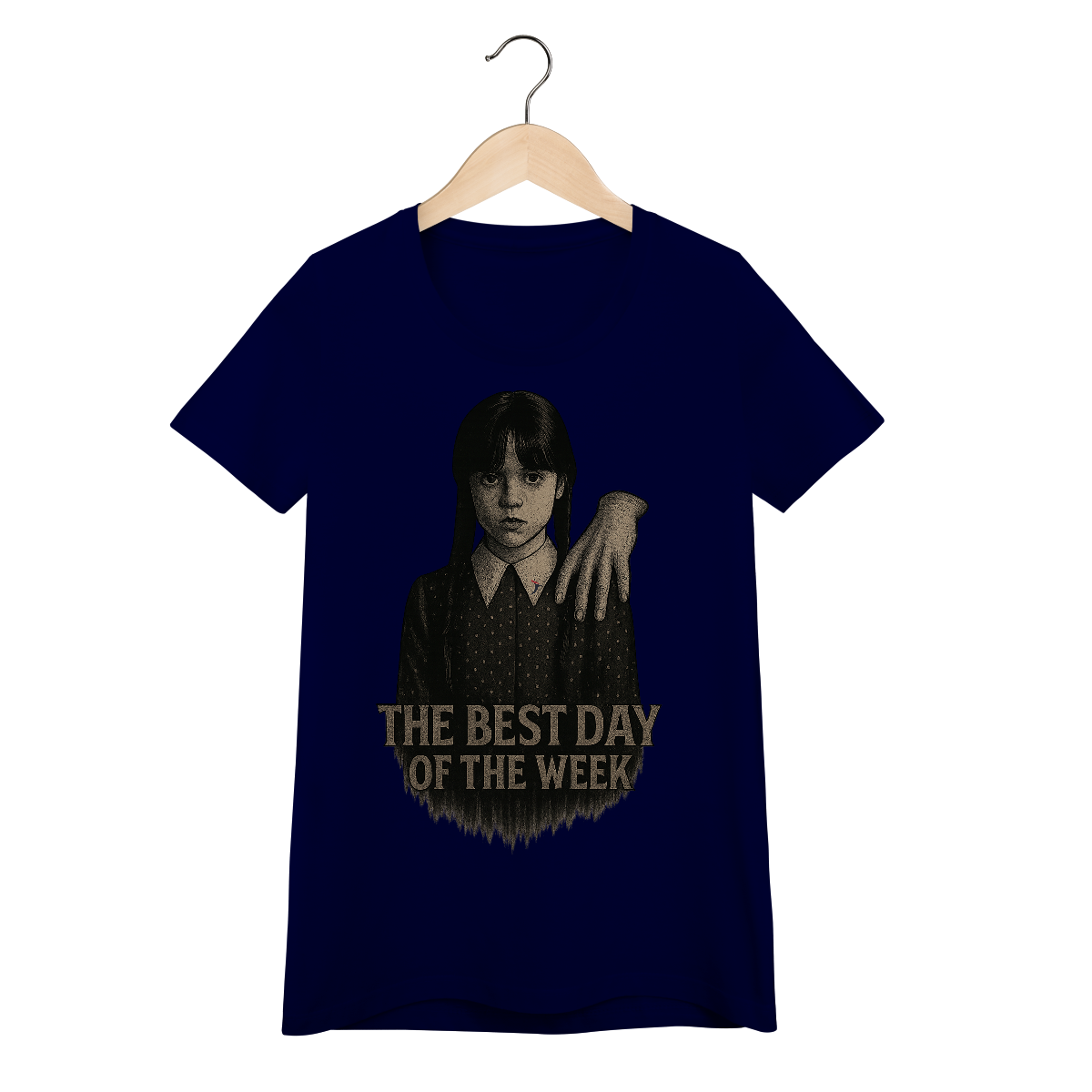 Tanto a série, quanto a personagem Wandinha, originalmente chama Wednesday (quarta-feira) e por isso o "trocadilho" com a frase The Best Day of the Week, na estampa. Traduzindo para o português: O Melhor Dia da Semana.