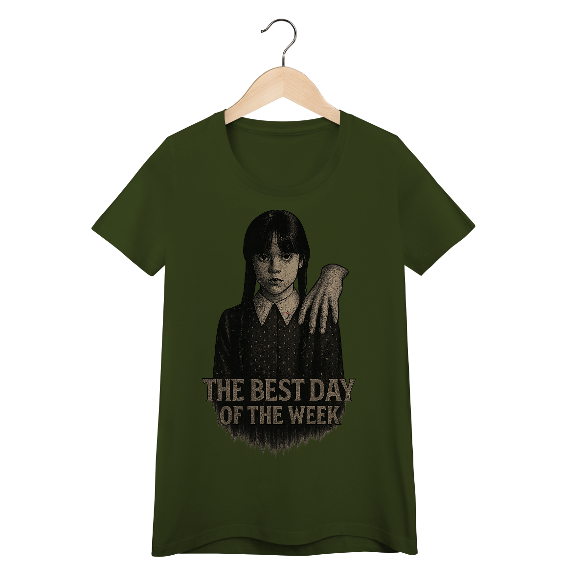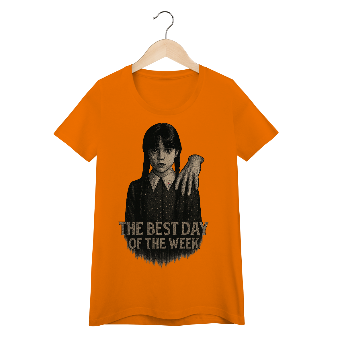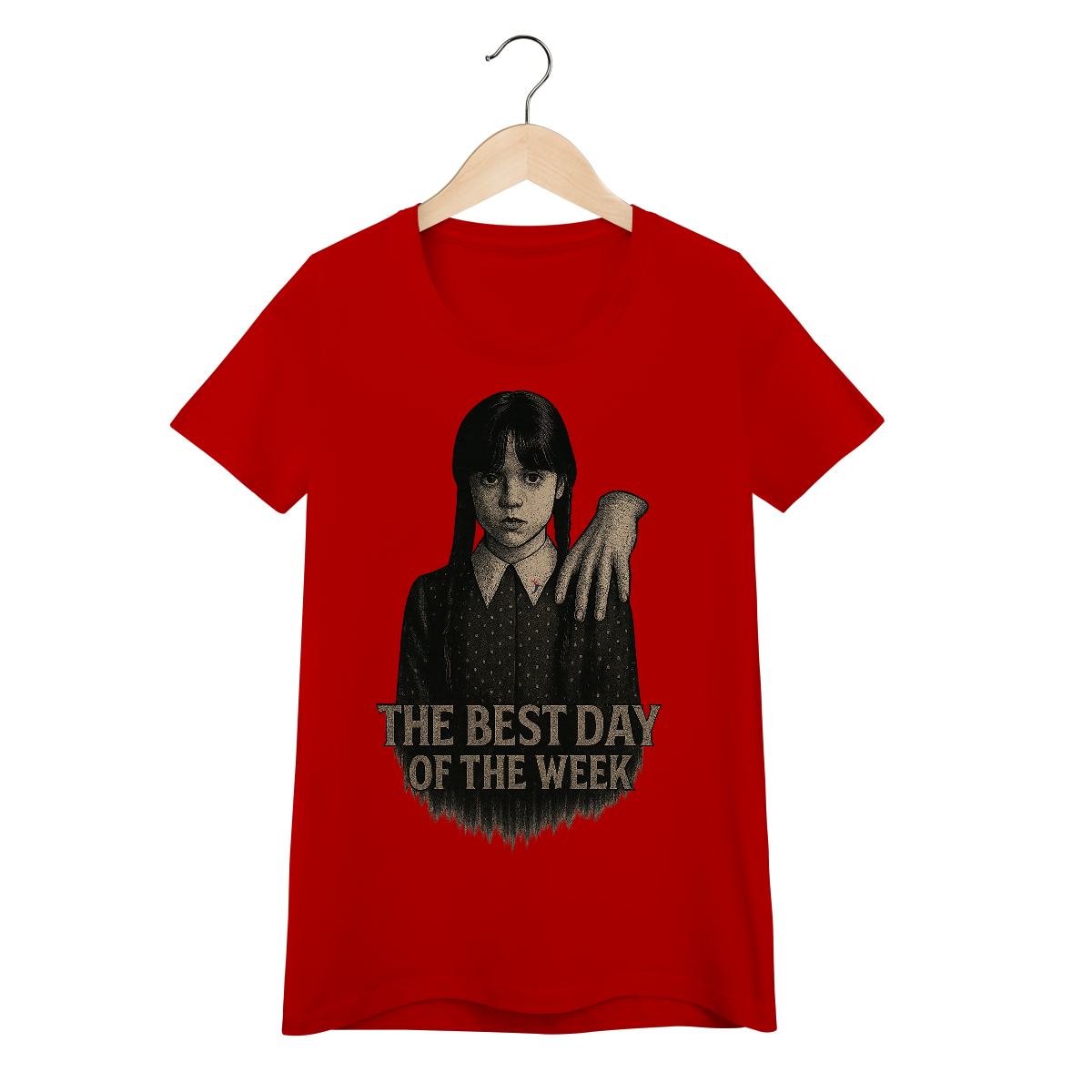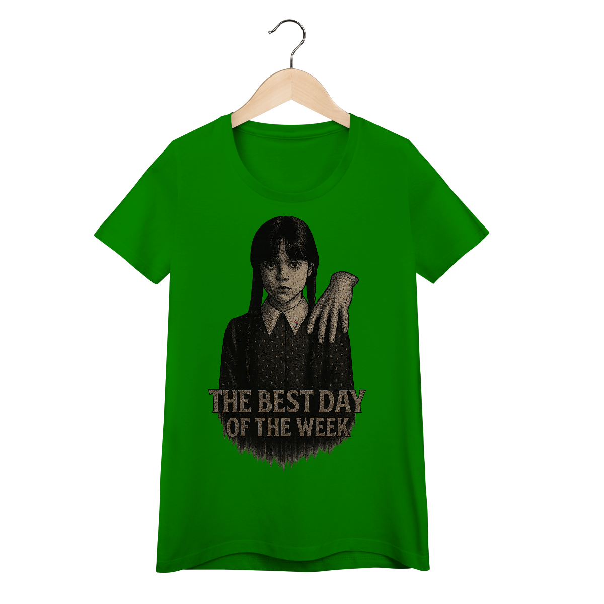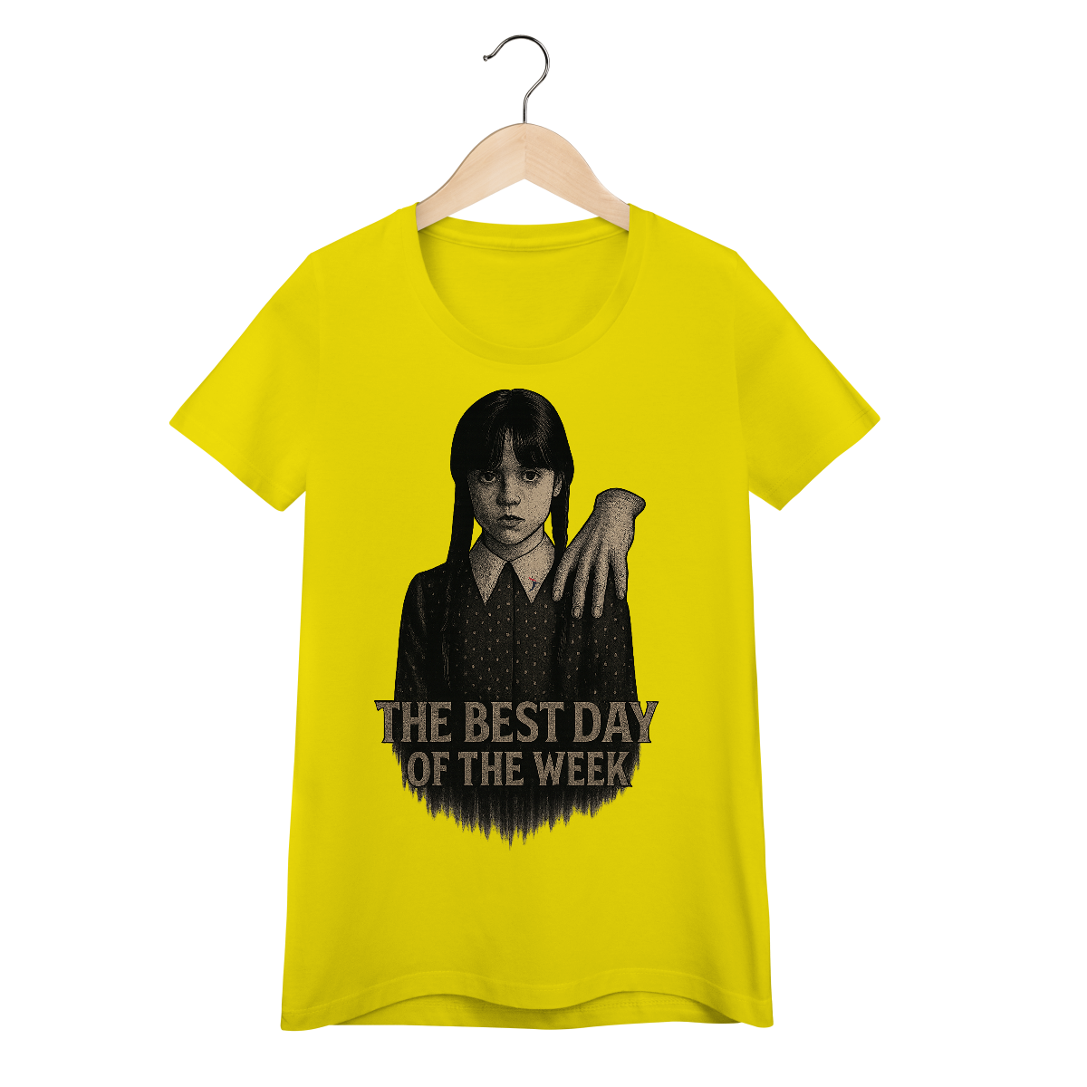 Tanto a série, quanto a personagem Wandinha, originalmente chama Wednesday (quarta-feira) e por isso o "trocadilho" com a frase The Best Day of the Week, na estampa. Traduzindo para o português: O Melhor Dia da Semana.
