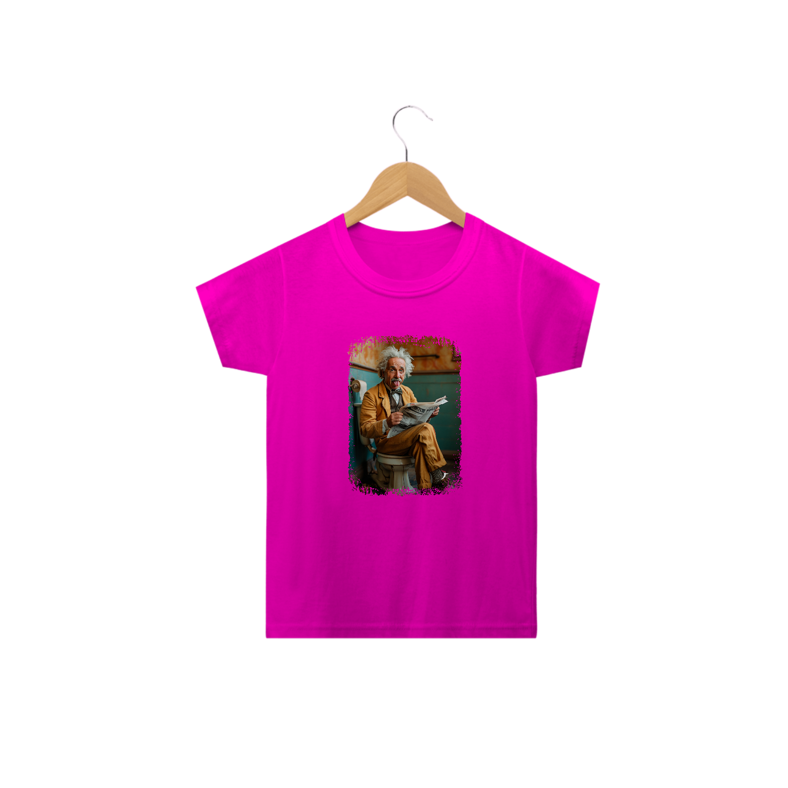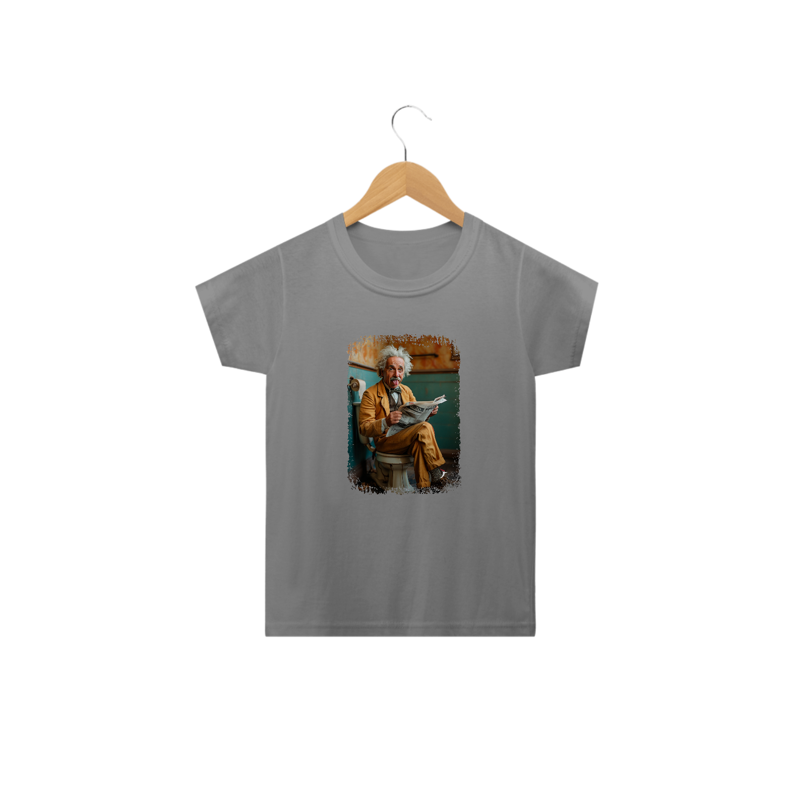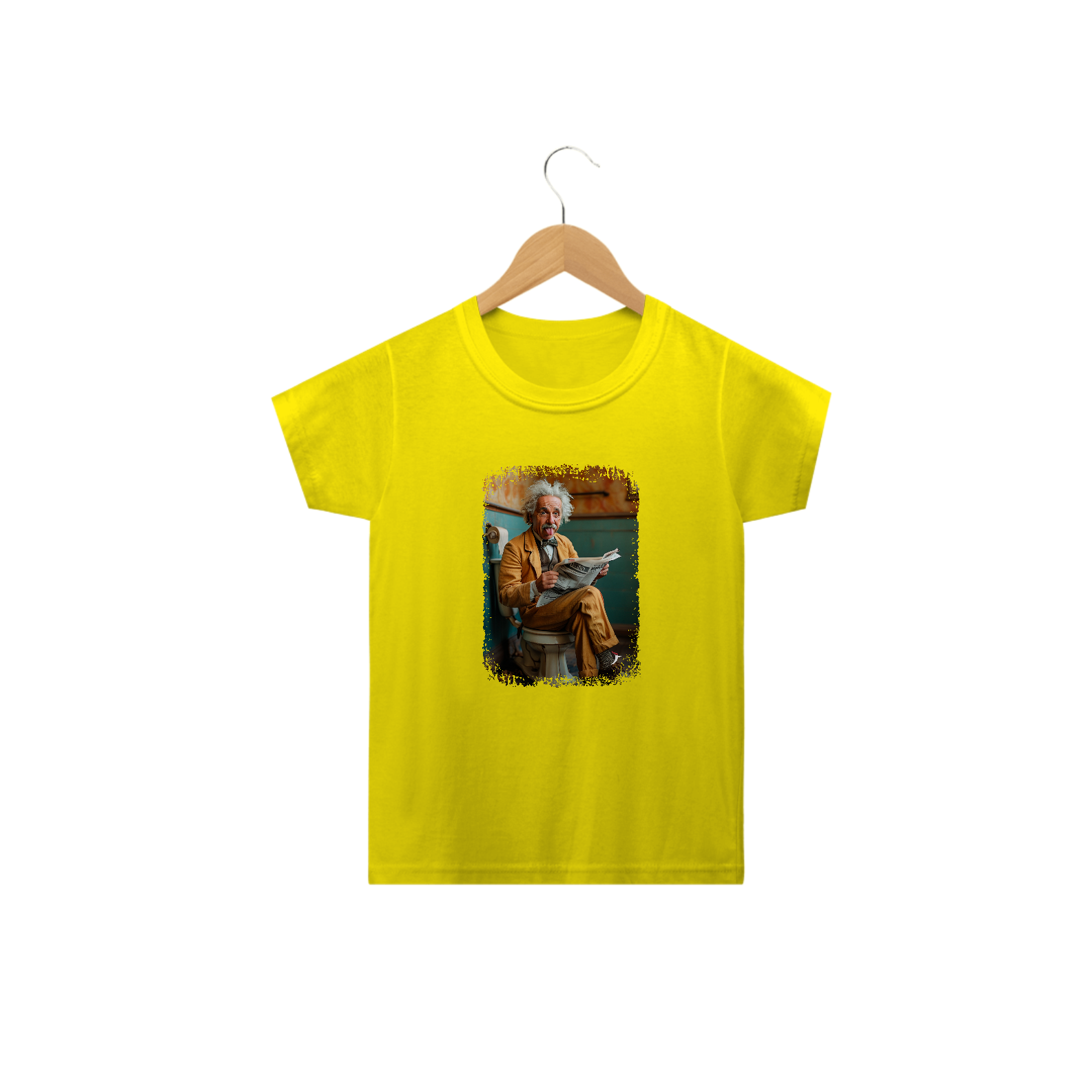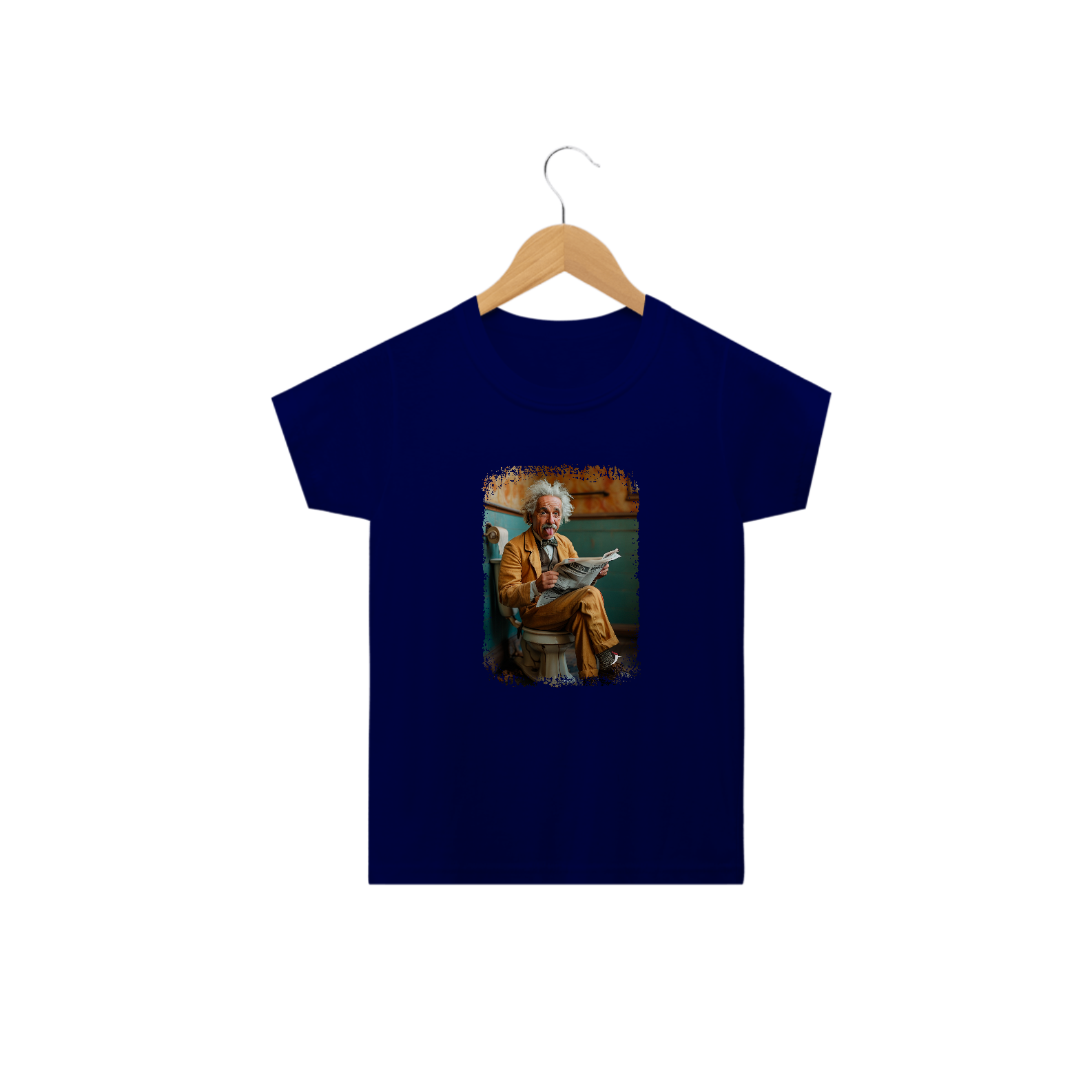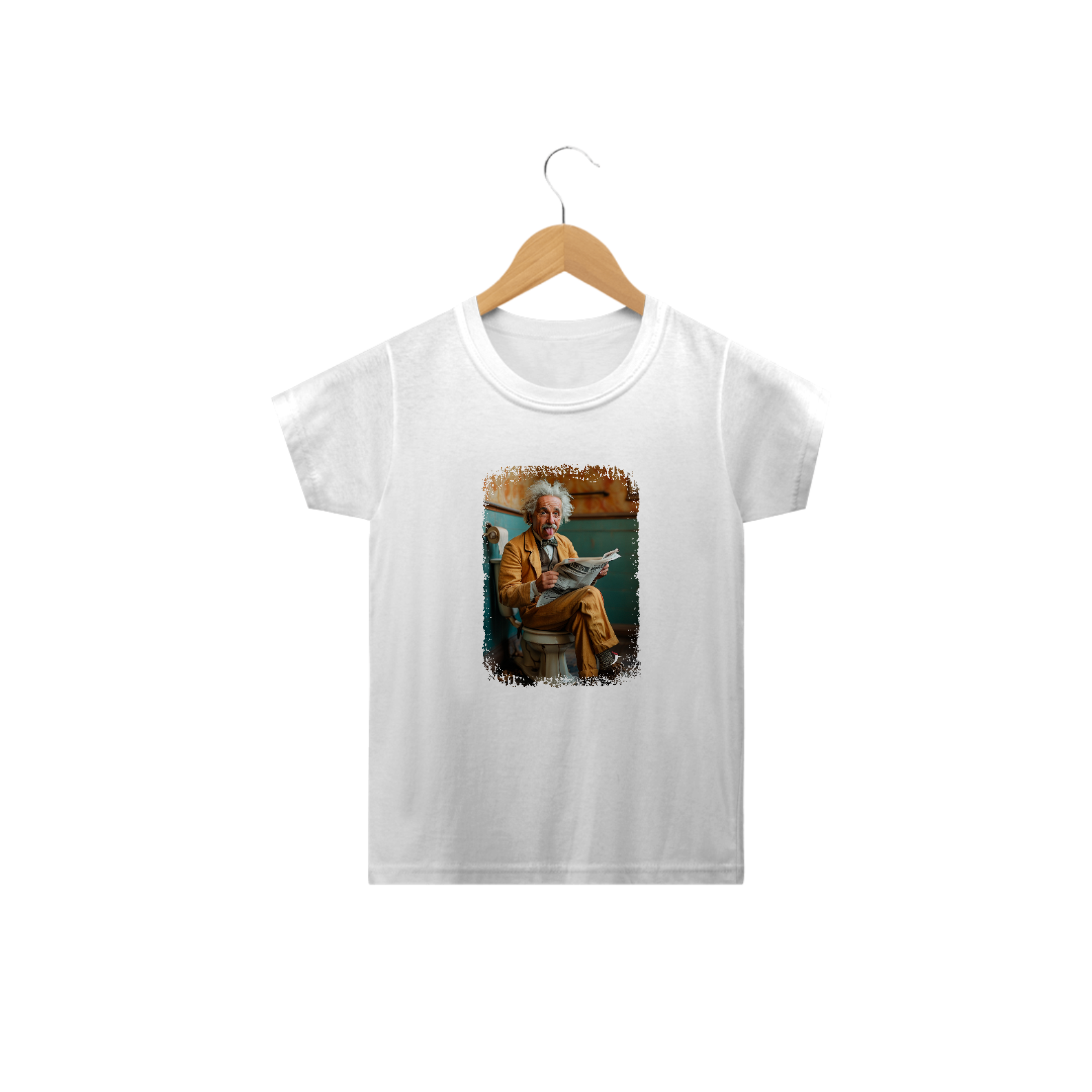 Estampa engraçada com o Albert Einstein sentado na privada e lendo jornal.