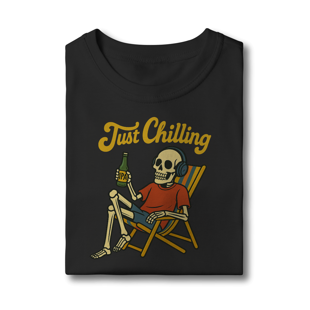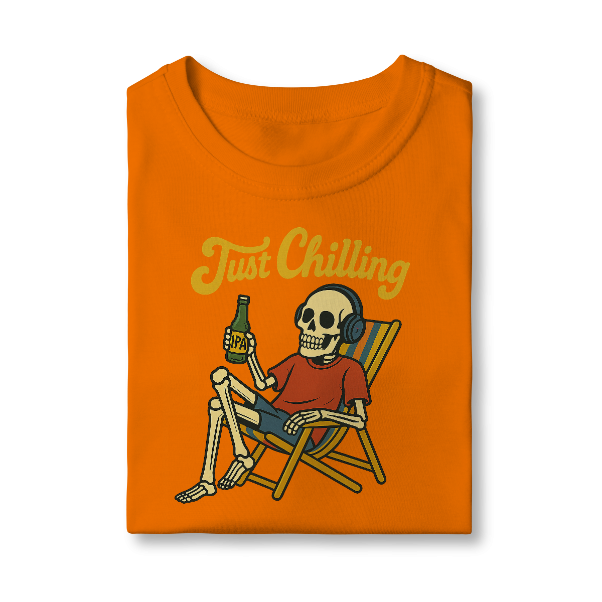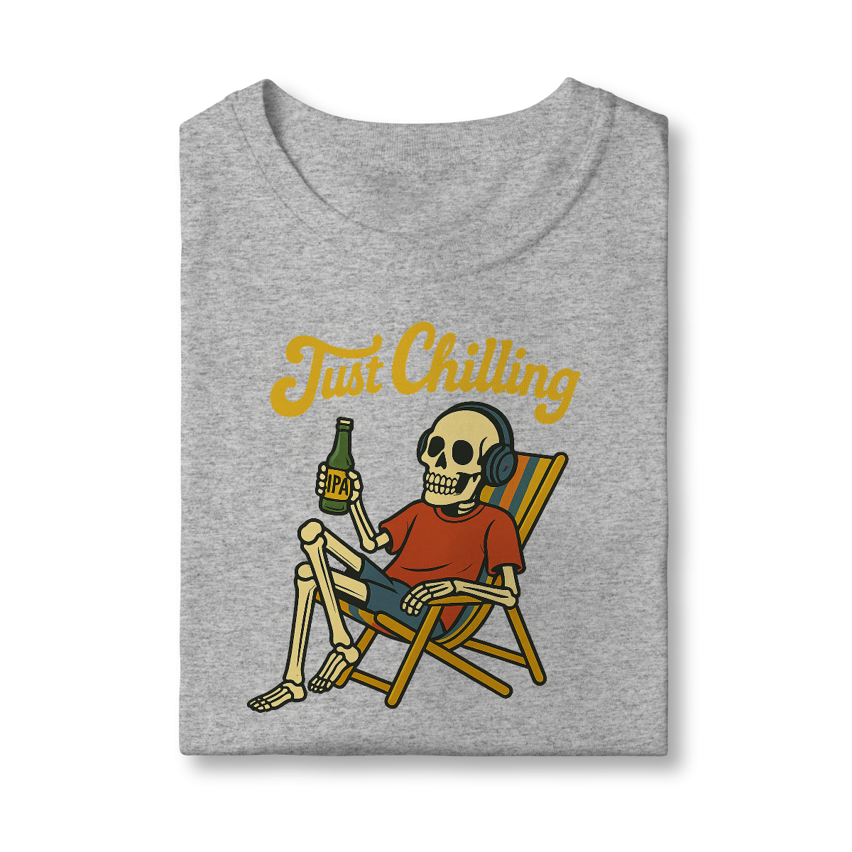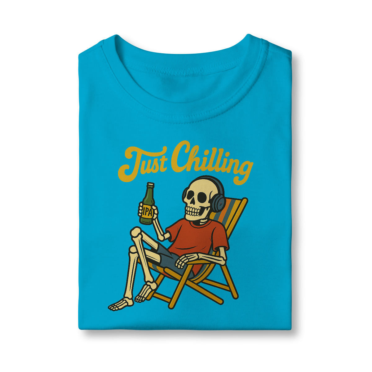 Estampa bem humorada com o esquelo de alguém que passou muito tempo relaxando na praia tomando uma cervejinha!