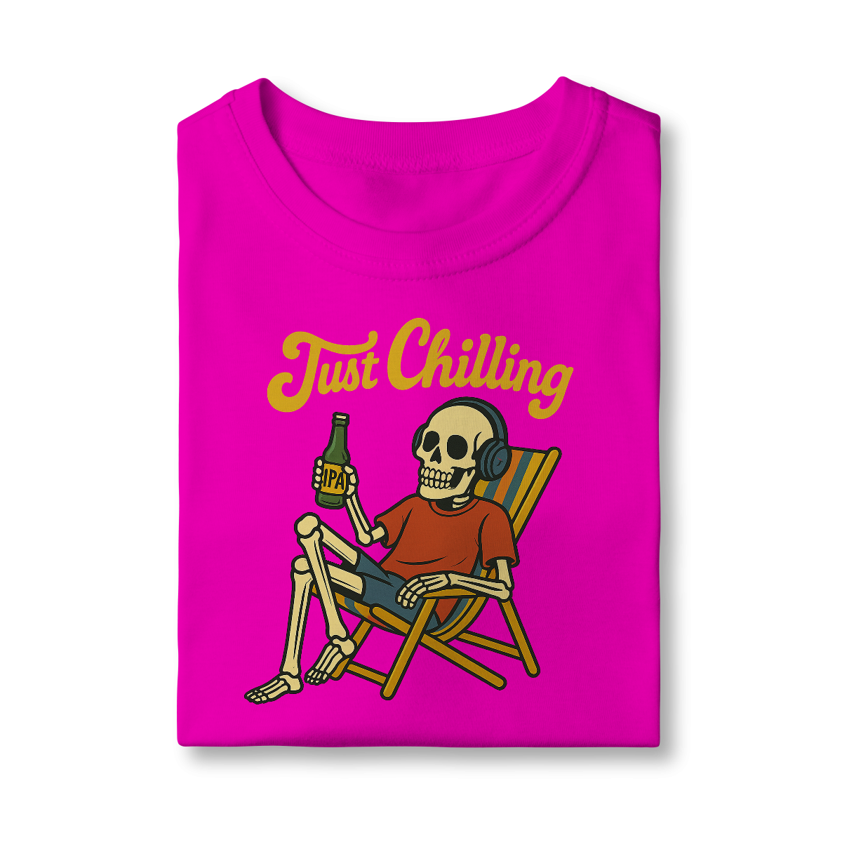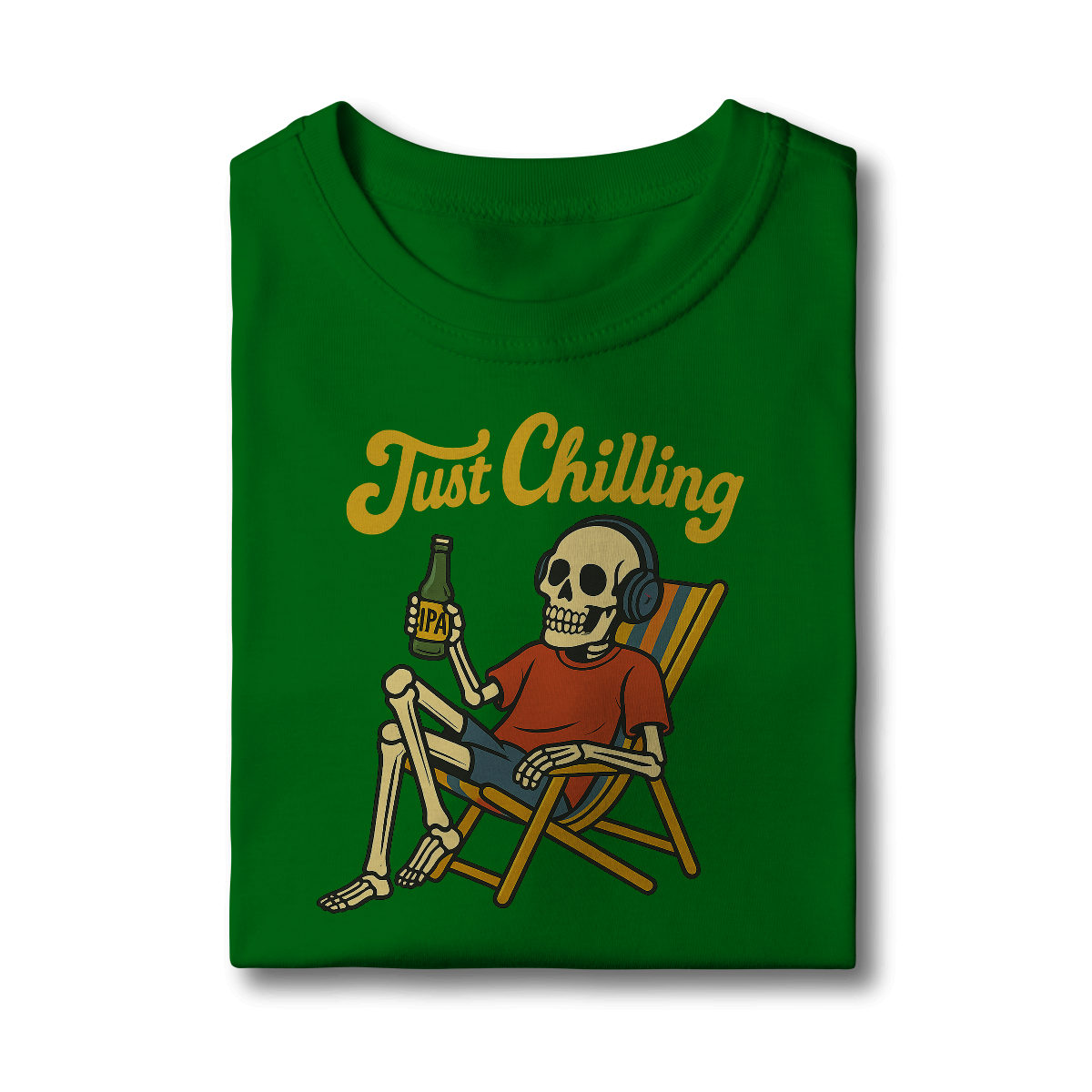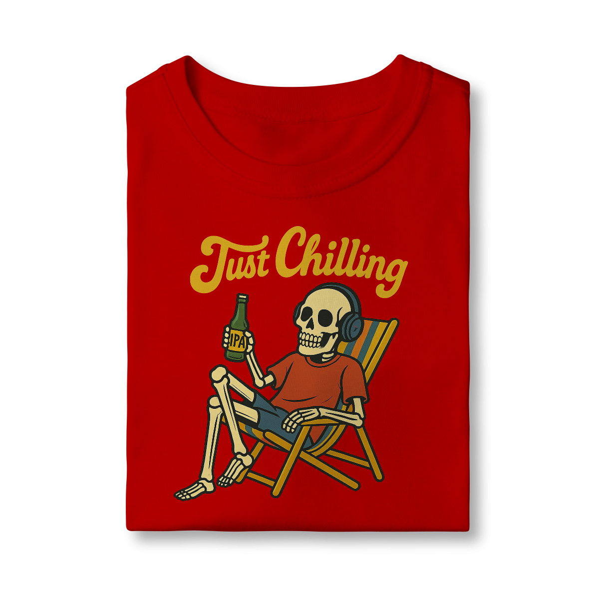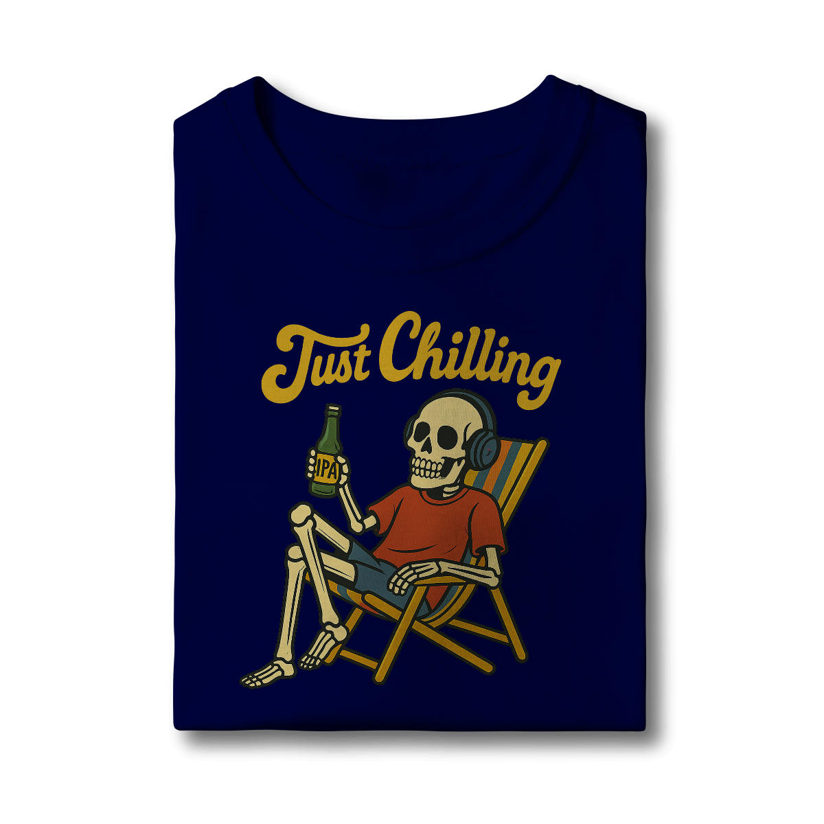Estampa bem humorada com o esquelo de alguém que passou muito tempo relaxando na praia tomando uma cervejinha!