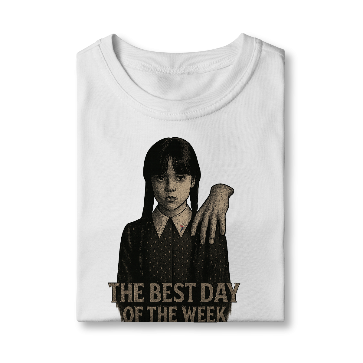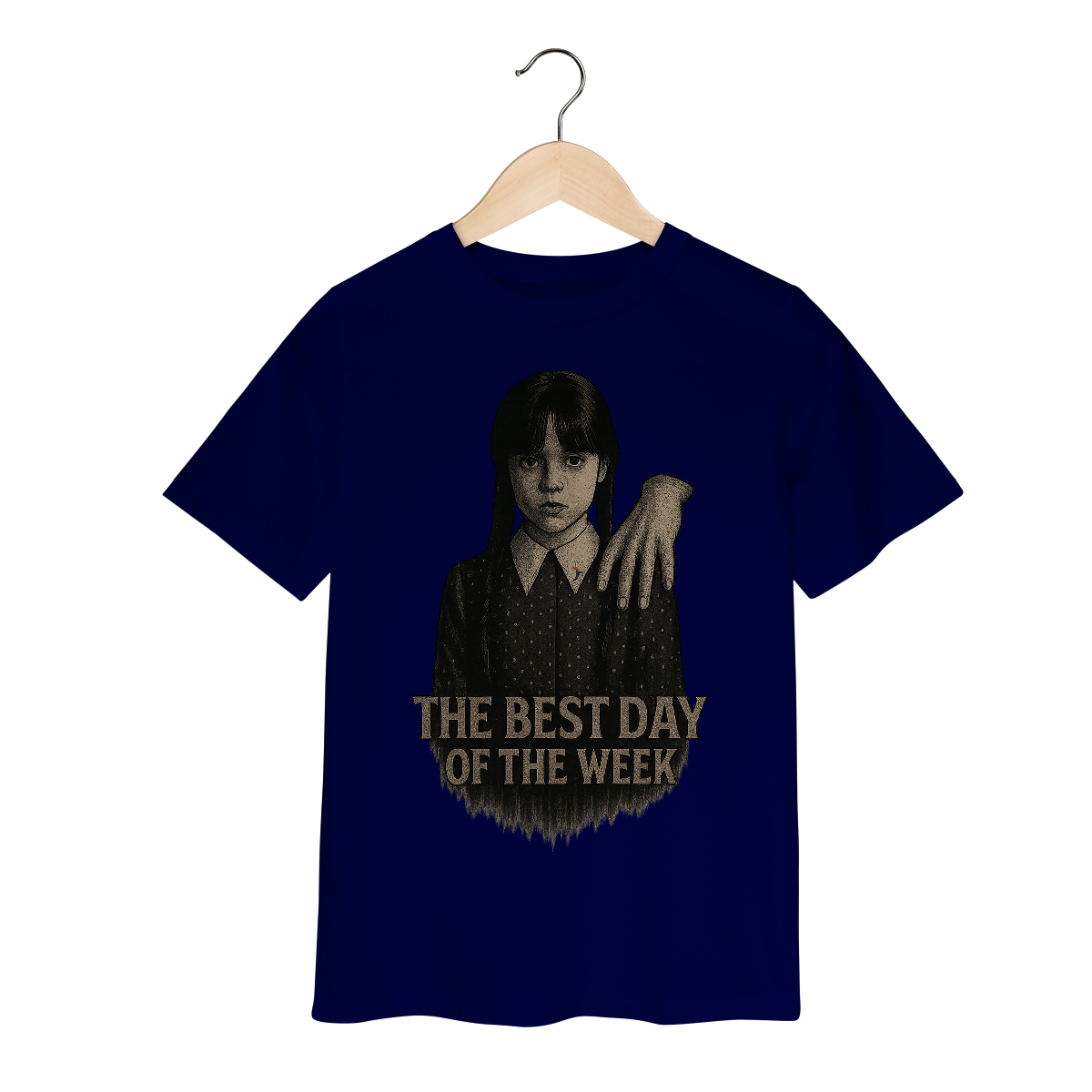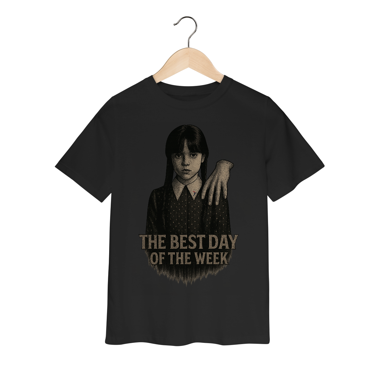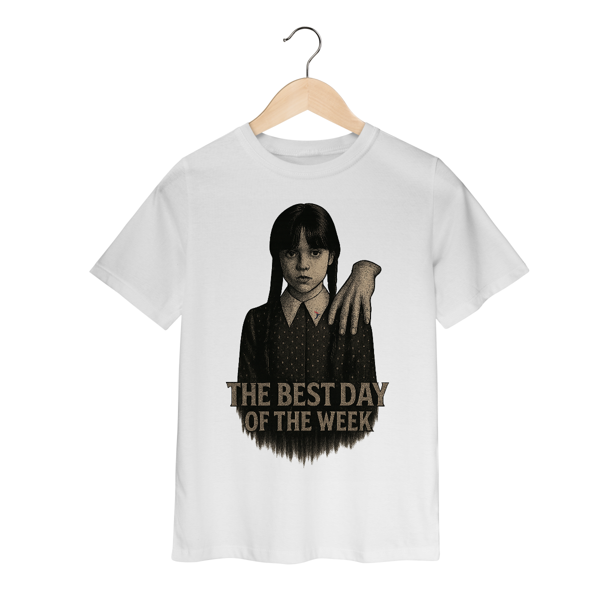 Tanto a série, quanto a personagem Wandinha, originalmente chama Wednesday (quarta-feira) e por isso o "trocadilho" com a frase The Best Day of the Week, na estampa. Traduzindo para o português: O Melhor Dia da Semana.