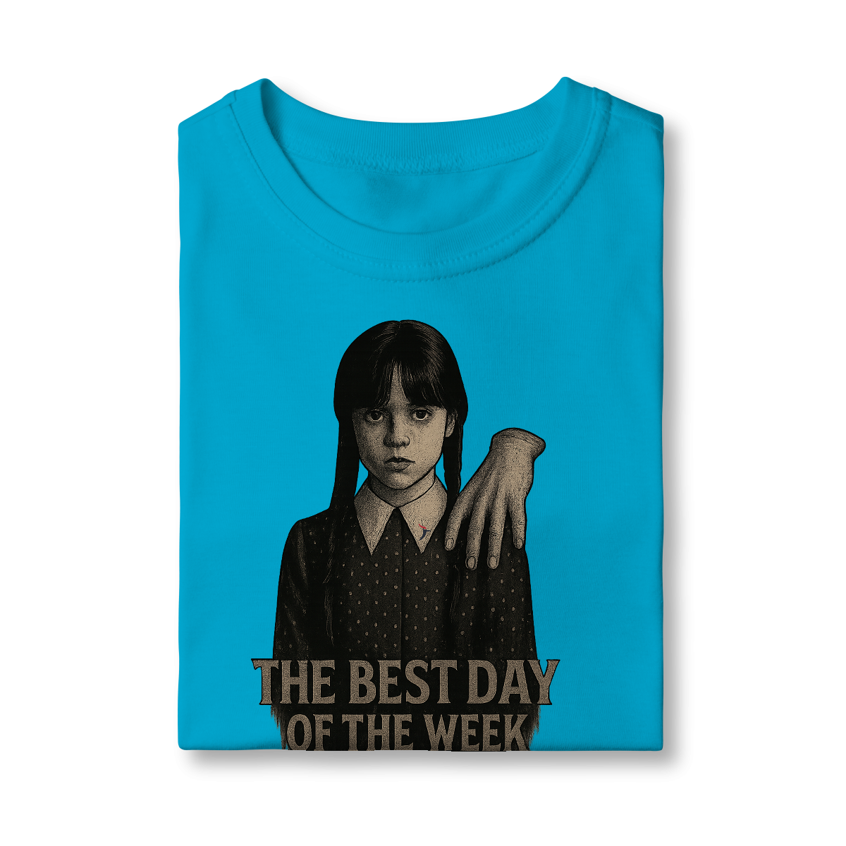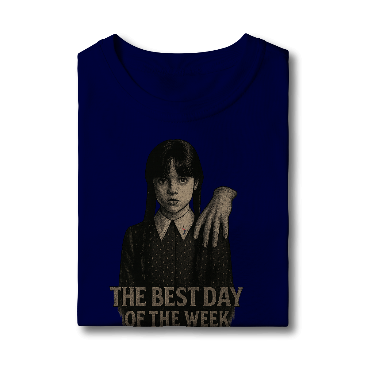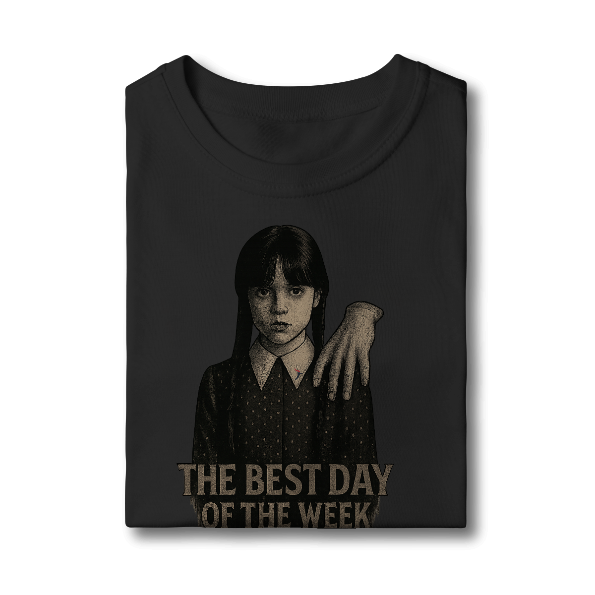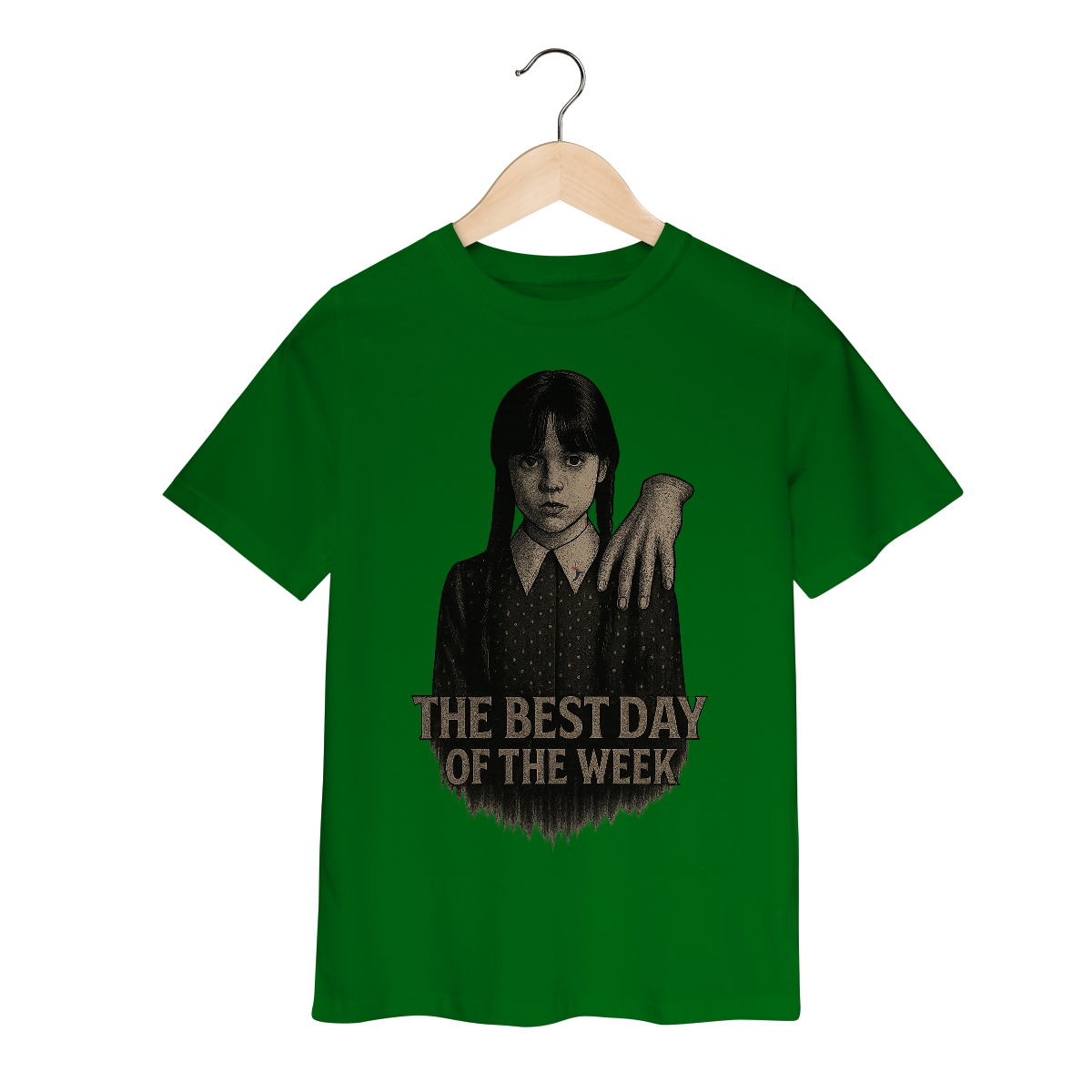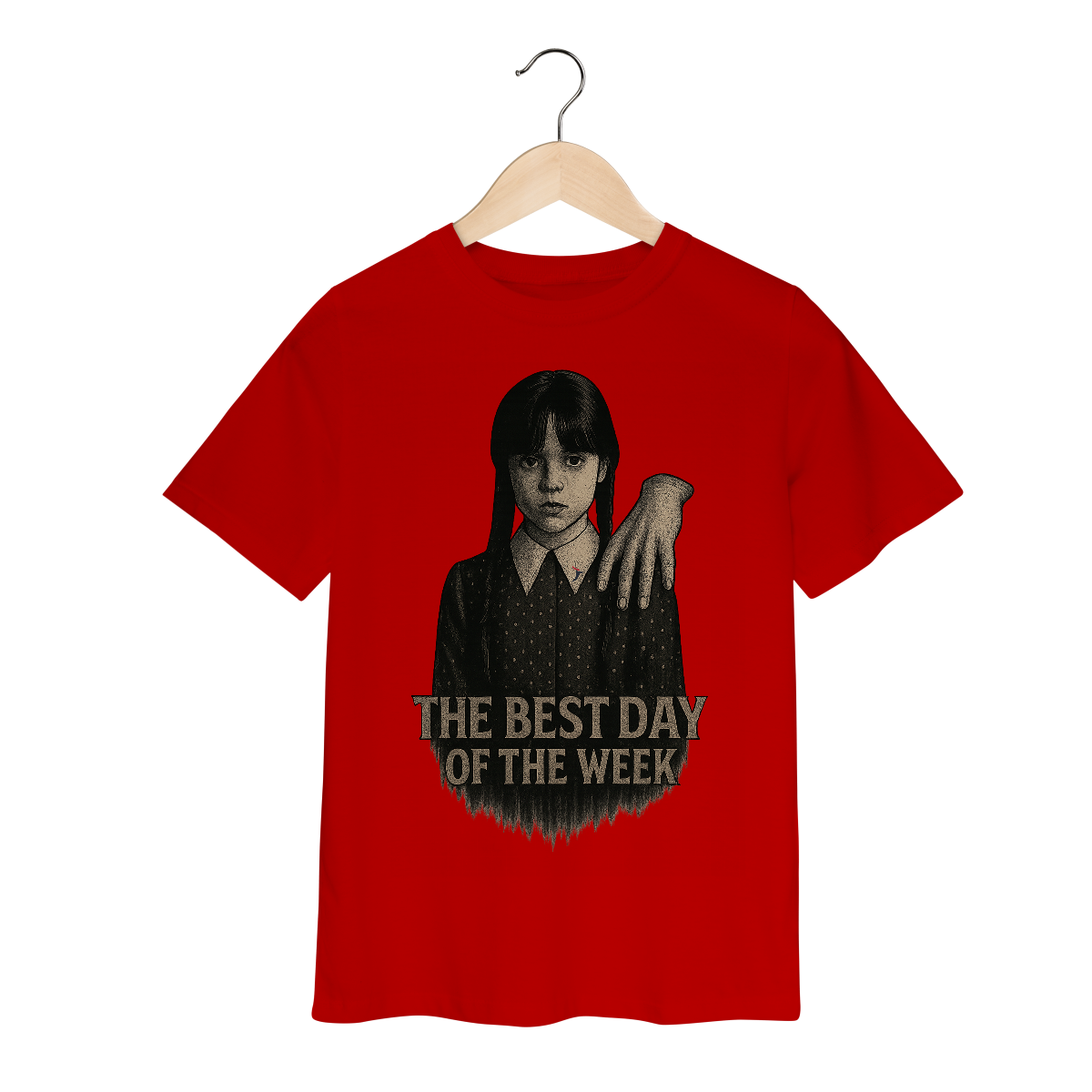 Tanto a série, quanto a personagem Wandinha, originalmente chama Wednesday (quarta-feira) e por isso o "trocadilho" com a frase The Best Day of the Week, na estampa. Traduzindo para o português: O Melhor Dia da Semana.
