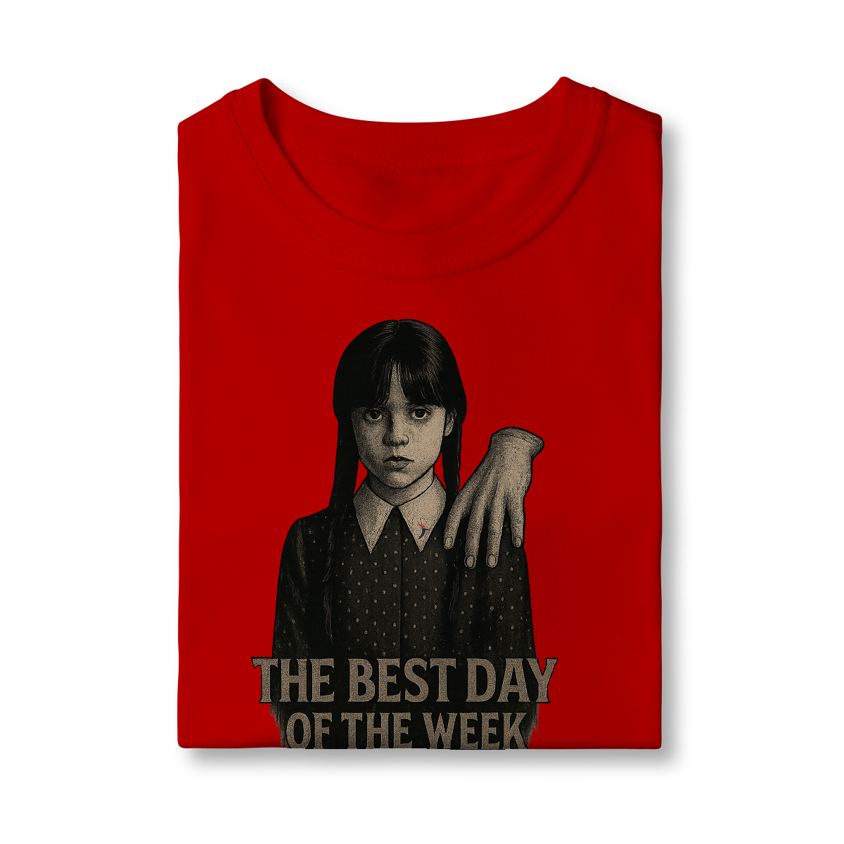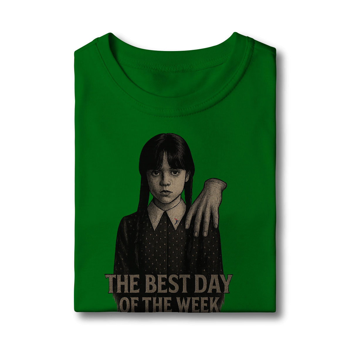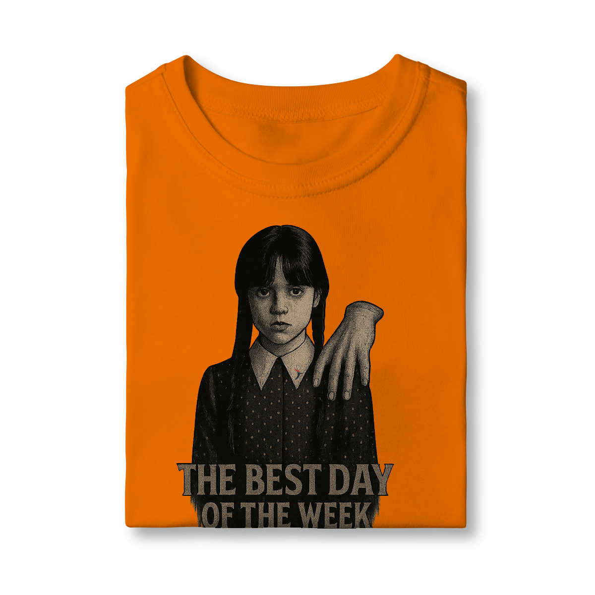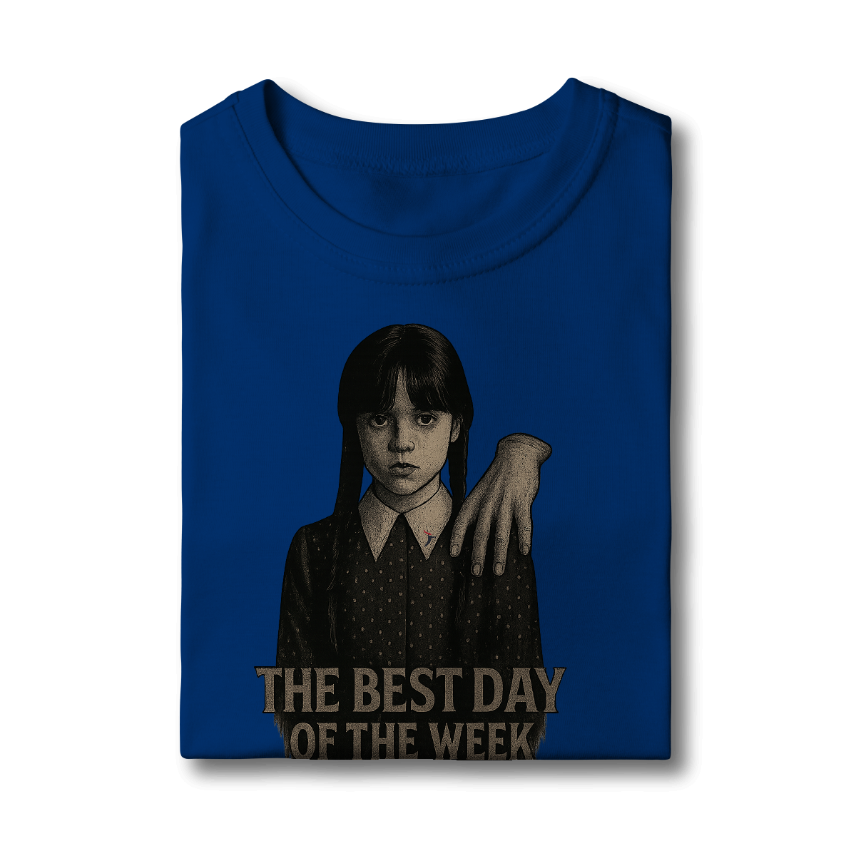 Tanto a série, quanto a personagem Wandinha, originalmente chama Wednesday (quarta-feira) e por isso o "trocadilho" com a frase The Best Day of the Week, na estampa. Traduzindo para o português: O Melhor Dia da Semana.