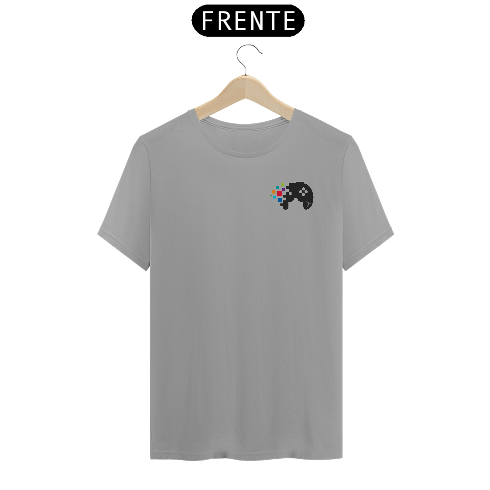 Estampa com um controle de vide game pixelado, na altura do peito.