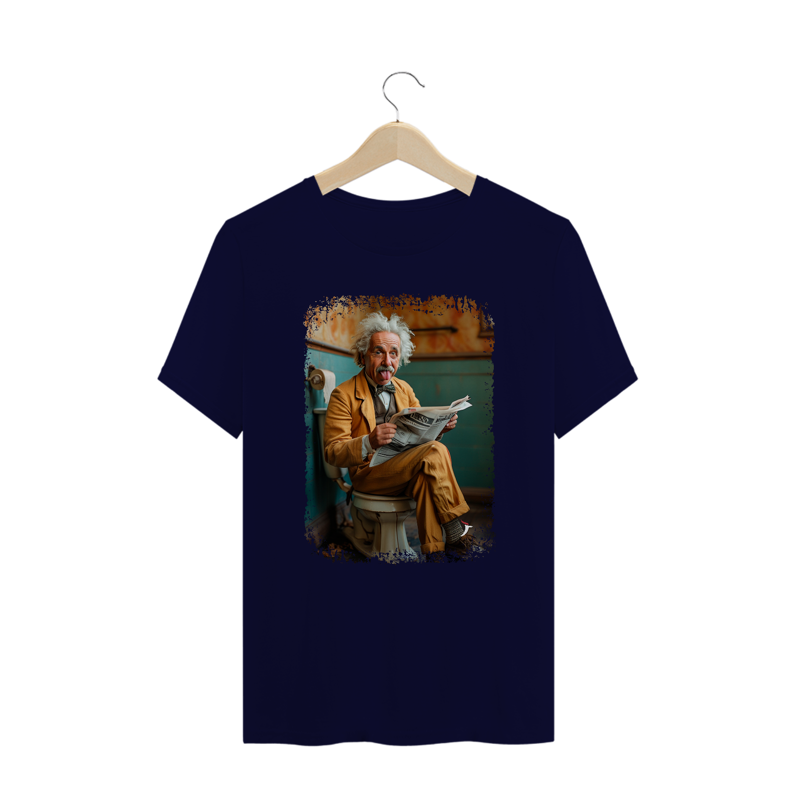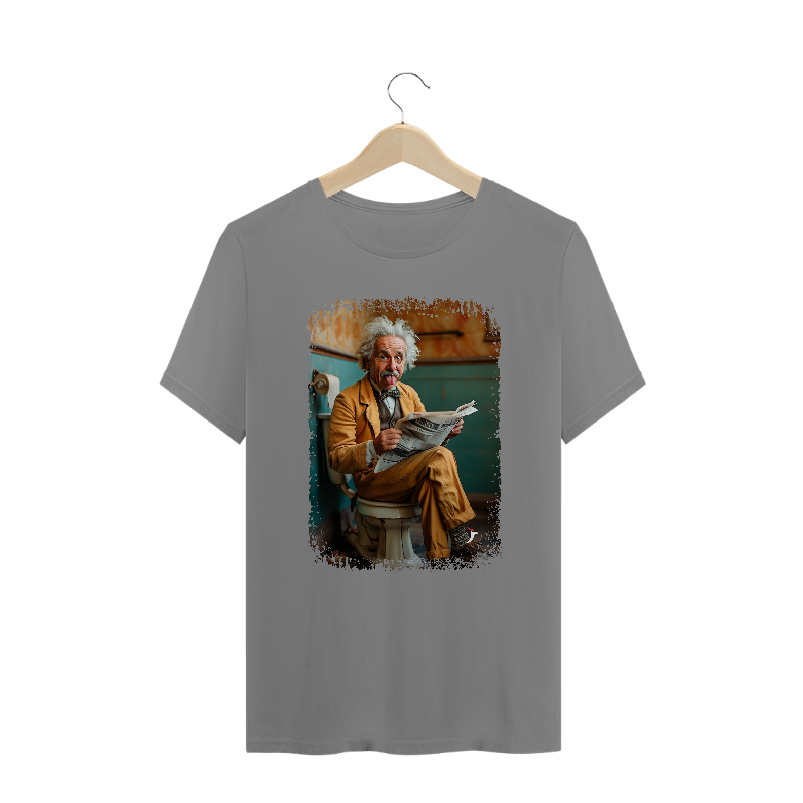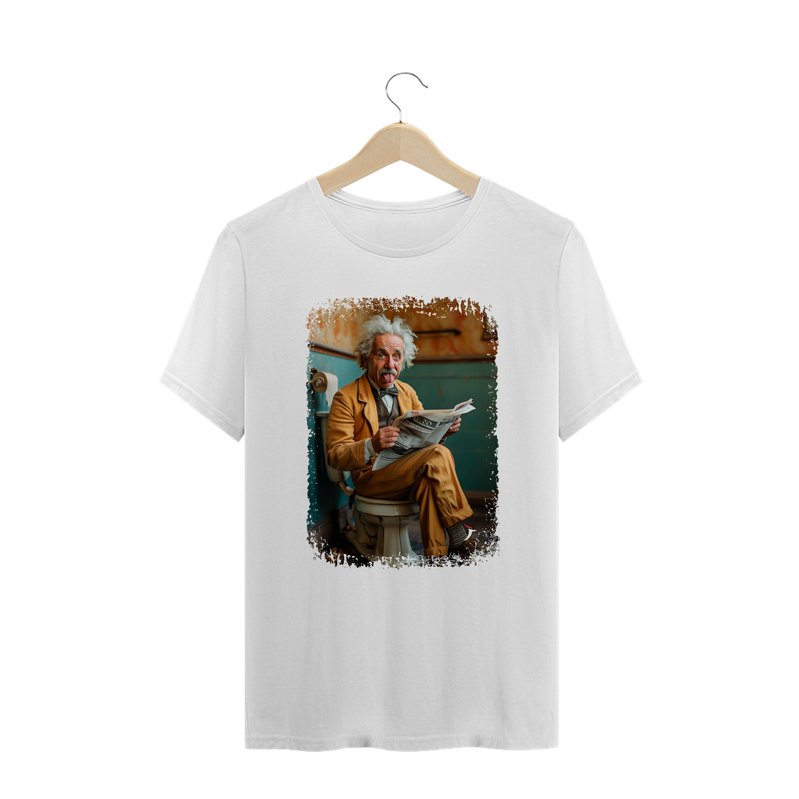 Estampa engraçada com o Albert Einstein sentado na privada e lendo jornal.