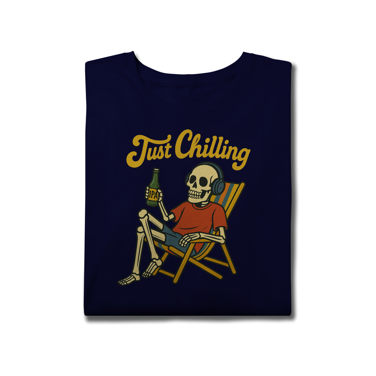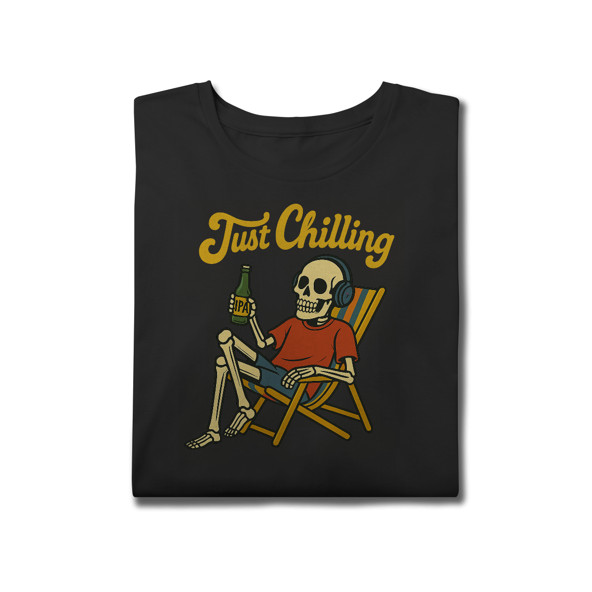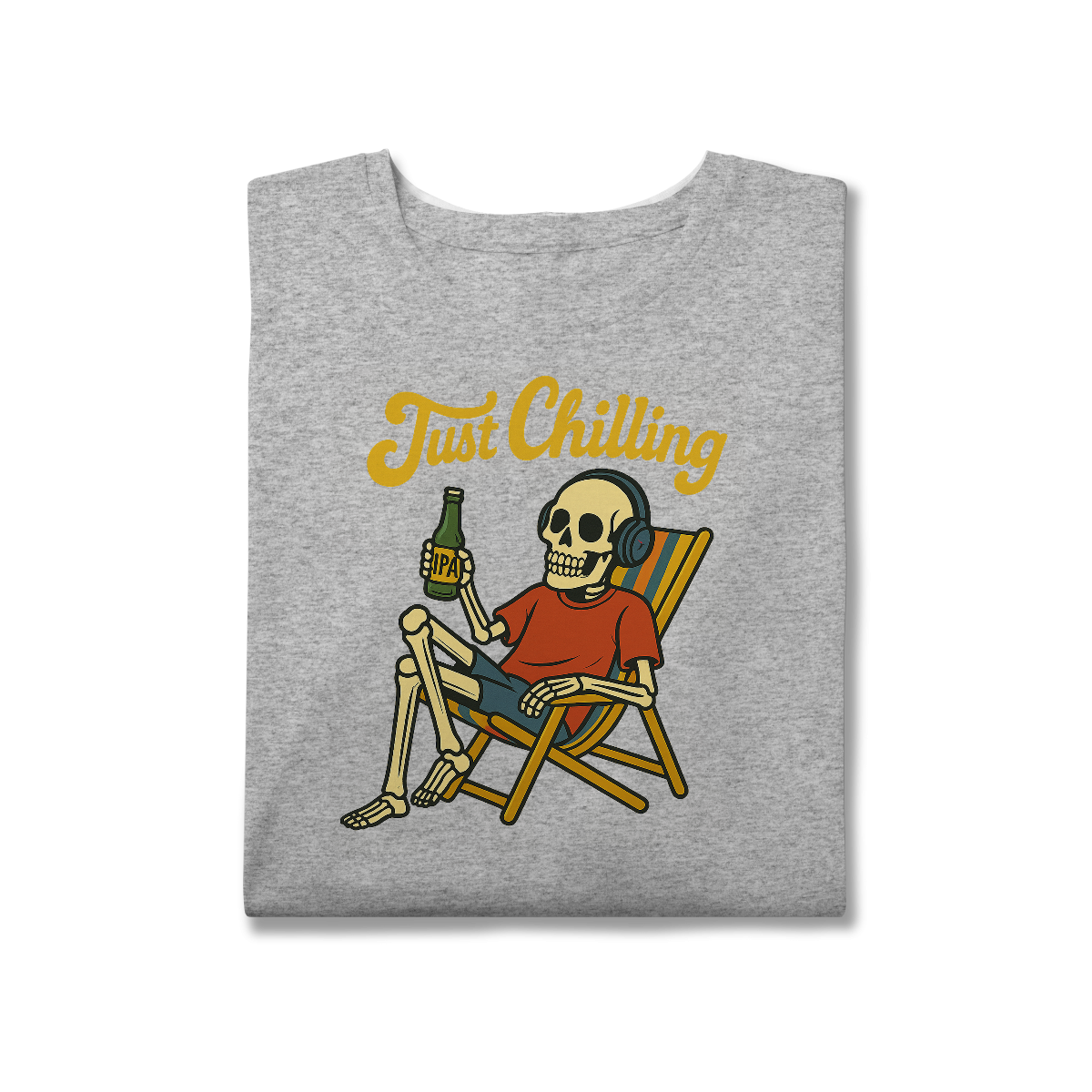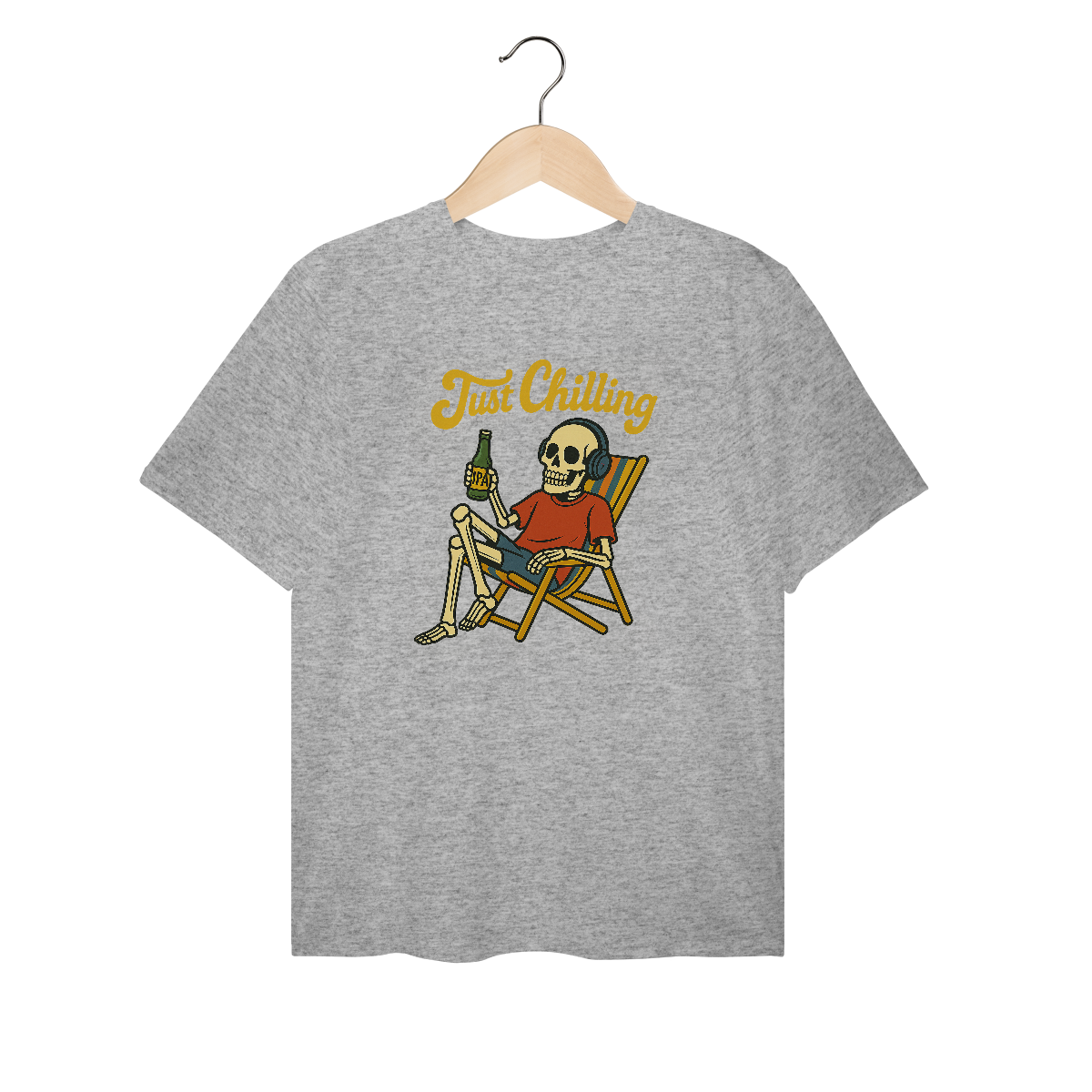 Estampa bem humorada com o esquelo de alguém que passou muito tempo relaxando na praia tomando uma cervejinha!