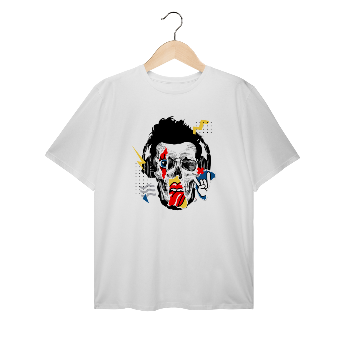 Estampa impactante em estilo pop art/street, trazendo um rosto de caveira com fones de ouvido e elementos gráficos (raios, recortes e pontilhados). Um visual cheio de atitude, perfeito para quem curte música, rock e uma pegada urbana moderna.